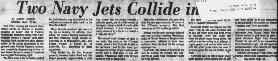August 30, 1978: Ens. Michael J. Kemph, 24, and Ens. Joseph K. Naworcki, 26, ejected after a midair collision between their NAS Chase, Beeville, TA-4J training jets (BuNo 158510 and BuNo 156931) during routine three plane training flight. The third plane in the formation piloted by instructor Lt. Eric A. Vancourt was not involved in the collision and returned safely to the Beeville airport. One plane crashed to earth in a field owned by the Victoria airport and the other plunged at least 10 feet under the earth on the O'Connor estate. Naworcki said his plane began losing power and he was descending in an attempt to regain power when the nose of Kempf's plane hit the tail section of his. Kempf was the most seriously injured with a concussion believed to have occured when his head hit the canopy upon ejection. The Victoria Advocate, (cont) Friday, August 31, 1978. Ens. Michael J. Kemph and Ens. Joseph K. Naworcki ejected after a midair collision between their NAS Chase, Beeville, TA-4J training jets. Both pilots were picked up by a Naval helicopter and transported to a local hospital. The crash involving two of the three jets participating in a three-plane training maneuver occurred about 5:20 p.m. about six miles N of Victoria, TX. An eyewitness said one aircraft was flying straight up and the other was crossing above it horizontally when the collision occurred. Longview News Journal, Thursday, 31 August 1978. Ens. Michael J. Kemph and Ens. Joseph K. Naworcki ejected after a midair collision between their NAS Chase, Beeville, TA-4J training jets during routine tactical maneuvers training shortly after 5 p.m. Wednesday. The planes crashed to earth about a half-mile apart in the vicinity of the Victoria airport and O'Connor ranch. The altitude at the time of the crash is believed to have been between 14,000 and 15,000 feet. Kempf remained in Citizens Memorial Hospital Thursday recovering from a concussion. The Victoria Advocate, Friday, September 1, 1978.