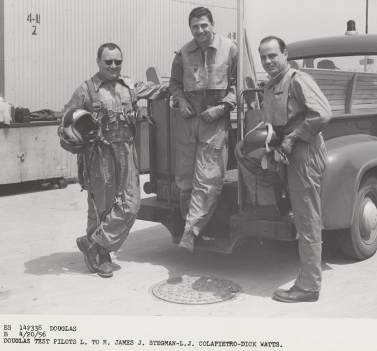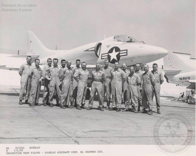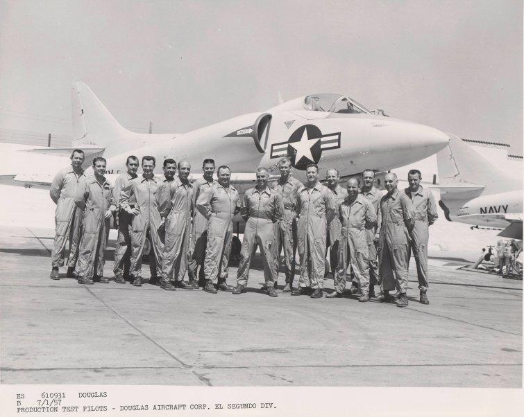 01 JUL 1957: Douglas Test Pilots pose in front of an A4D-1 (A-4A). The tail in the right of the picture is BuNo 142222, another A4D-1.